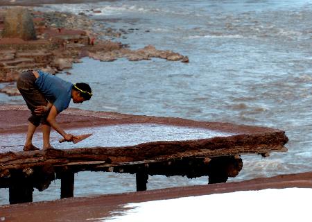等盐田里的水分慢慢干掉,一粒粒方形或菱形的盐结晶渐渐显现出来,就像影像在显影盆中出现那般神奇。女人们用木板仔细地将盐粒刮拢在一起,再撮到竹背箩里沥去剩下的水分,剩下的就是她们的辛劳所得——盐巴。