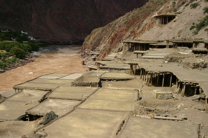 沿陡峭的江岸而上,就是一片片层层叠叠用木架子支撑起的盐田,一片片盐田之间用简易的栈道连通,即使是空手上下都很艰难吃力。那些木架子盐田错落有致,鳞次栉比,有的刚倒入盐水,风吹水面,波光粼粼;有的水分已经蒸发,洁白的盐晶映着雪山夕阳,闪耀着迷人的光彩;有的还没来得及倒盐水,裸露着棕红色的台面,朴实无华。这些五彩斑斓的盐田又与奔腾的江水,与江岸台地上的农田,与一株株葱郁的核桃树,构成了一幅壮丽的画面,令人难忘。