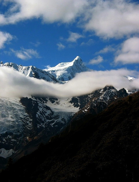 地处横断山系的怒山山脉,是南北走向的庞大雪山群体。北段称梅里雪山,中段称碧罗雪山,但习惯上将位于德钦县境内的北段和中段,统称梅里雪山。梅里雪山,北连西藏阿冬格尼山,南与碧罗雪山相接,平均海拔在6000米以上的便有10多座,称“太子十三峰”。那佼佼立于十三峰之上的卡瓦格博峰,海拔6740米,为云南第一峰。它是康巴藏民顶礼膜拜的“神山”。30年代探游过世界不少名山大川的美国学者洛克博称卡瓦格博峰是“世界上最美之山”。卡瓦格博峰下,冰斗、冰川连绵。其中“明永恰”和“斯恰”如两条银鳞玉甲的长龙,从海拔5500米往下绵延至2700米的森林地带,离澜沧江面仅800多米,这是世界上罕有的低纬度、高海拔季风海洋性的现代冰川。
