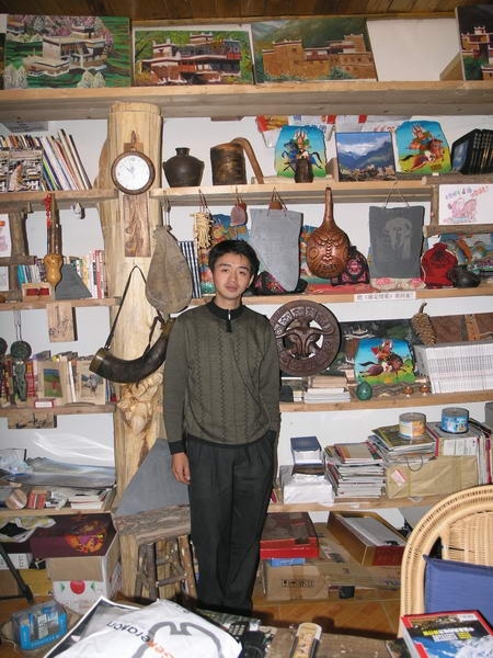 我也看到了丹娃在丹巴友多“呆驴巢”著名的原木大书架前的留影。欣喜的我一眼就看到了: