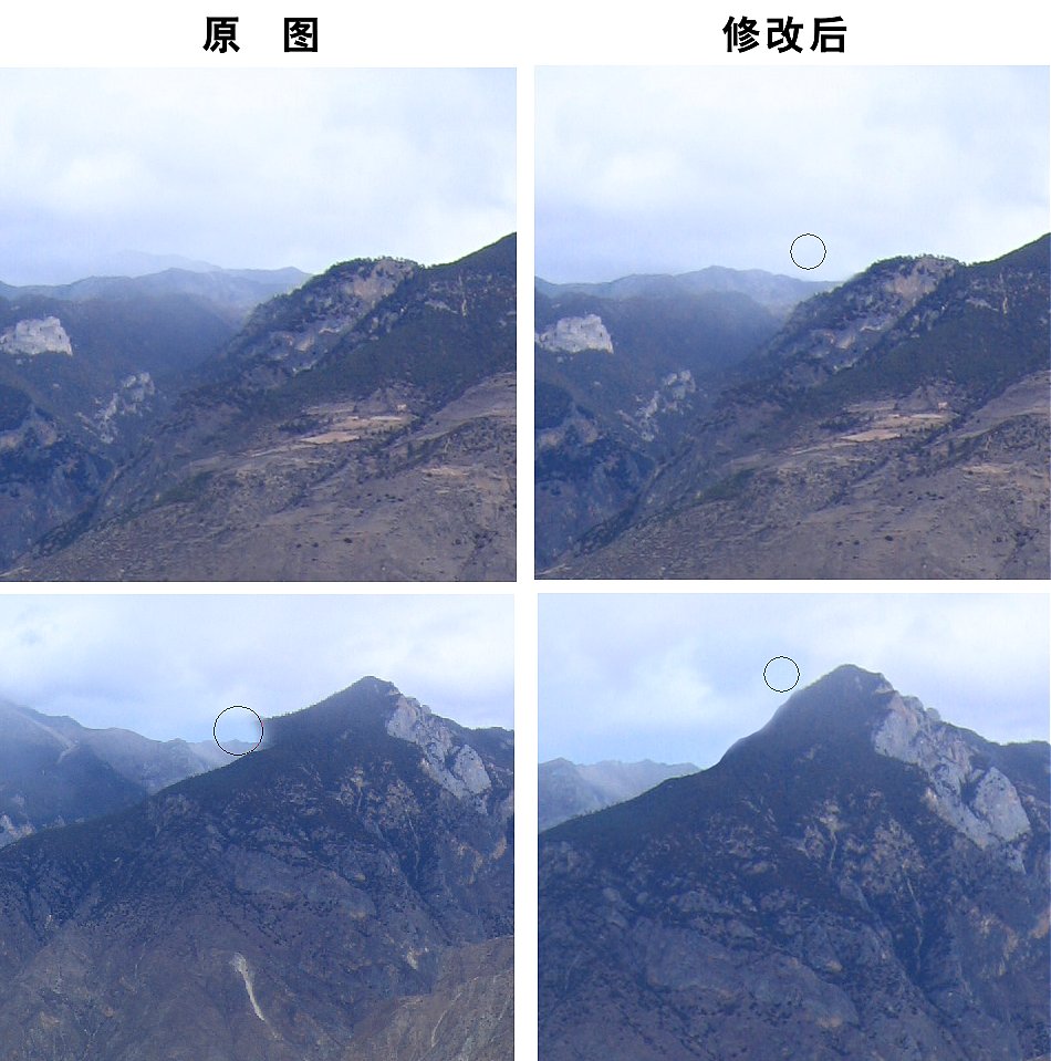 左一和左二顶部的山川有重叠,需用橡皮(E)修整一下,这是一个细致的工作,可以根据画面来修正一下山峰,呵呵。同样的整个拼接图中的其它几处细节也需要处理一下。这里的关键就是注意控制好橡皮的大小和硬度。