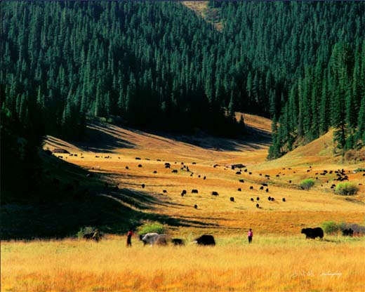 拉日马之美,美在自然。拉日马草原没有大草原那样的辽阔无垠和雄壮幽远,倒有些天山牧场或东方“阿勒泰”的神韵,森林、草甸、雪峰、溪流、蓝天、白云在这里完美组合,形成一幅绝妙的图画。画面层次分明,立体感强烈,近处是丝绒般嫩绿的草甸,草甸中间是波光鳞鳞蜿蜒的小溪和黑白相间散落的牧群。越过草甸,是高低起伏山丘,丘陵边是苍翠浓郁的森林,掠过森林,顶端是湛蓝的天空和游动的白云,更远处是闪着银光的雪峰。当白云飘过,光与影合谐搭配,留下无数佳作。画面色彩丰富,勾画细腻。春天,绿意铺满溪边、草坡、山岗、树梢,仿佛为大地铺上了一层厚实的绿毯,让人心旷神怡;当你还没有从这种绿意中陶醉过来,草原的夏季便已来临,草地上各色鲜花次第竞相怒放,拉日马大地白一圈、黄一片、紫一团,美不胜收。从每年的4月底到8月底,草原就不停地变换着色彩,怒放着姹紫嫣红。当秋天走来,茂密绵长的牧草便穿上了金黄的外套随风摇弋,那醉人的金黄,真有些摄魂掠魄。到了寒冷的冬季,草原是有些萧条,但时不时银装素裹的景致那也是别有一番滋味,苍凉而雄壮。