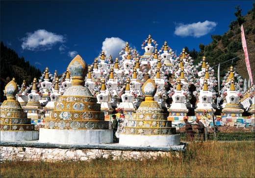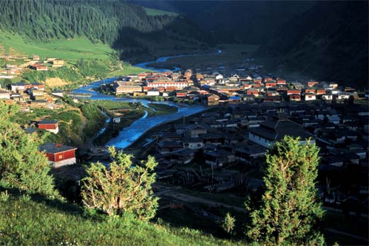 拉日马之美,美在人文。或许是地名就笼罩着一股神秘浪漫色彩,小镇拉日马被浓浓的地方人文特色包围着。小镇神奇古朴;一条惟妙惟肖的祥龙山脉静卧镇边,龙头恰好位于镇头,护佑着整个小镇,使小镇成为一块祥瑞宝地。或许,在大多数人信教的康巴地区,浓厚的佛教文化色彩并不罕见,但在小镇拉日马却异常浓郁。镇头,耸立着一个石刻大藏经《甘珠尔》彩色佛塔、一个尚未完工的刻着1亿遍六字真言的石片砌成的佛塔和一些其他的塔林,这里便成了村民们的宗教文化活动区,据信教群众讲,绕着塔走一圈就相当于默诵一遍《甘珠尔》,1亿遍六字真言。每天,镇里的老人和一些外地的信徒都到这里转经。小镇西头,还有一座在康巴地区独一无二的由113个佛塔组成的佛塔群,也吸引了不少的信徒,成为一道极为亮丽的风景。小镇位于森林怀抱中,小镇人修建房屋时却一例在房顶上盖上了就地取材的青石板,使小镇成为一个名符其实的石板藏寨,显得古朴端庄,特别是雨后初晴,阳光反射在还带些水露的青石板上,小镇便被一种闪耀的波光罩着,仿佛一个天外世界.