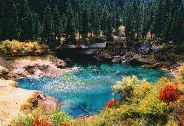 我永远忘不了初见她时的感觉,那日在鸟语花香的林间栈道上顺水上溯,渐行渐远,渐入佳境,天与地仿佛轻轻的被打开,青山绿树碧水蓝天扑面而来,我怔怔的望着,她的美丽让我的心跳停止,一时间竟忘了身在何方。就这样痴痴的,痴痴的,一步一步的向她走近。天是湛蓝湛蓝的,山是碧绿碧绿的,而二道海比天还要蓝,比山还要绿,更让人折服的是透明清新胜过空气的水。水面有的地方平静的没有一丝波纹,水底是静静舒展的水草和历历可数的高山裸鲤。二道海不大,轻轻躺在两山之间,我却感觉整个天地都在里面了;二道海不深,水底似乎伸手可及,我却感觉全部时间都融进去了。我在湖边静静的聆听,用我的心灵去聆听,聆听水中鱼儿的窃窃私语,聆听天籁之音与自己的心跳;我在湖边静静的朝拜,用我的灵魂去朝拜,朝拜大自然的心灵手巧,朝拜山水之间的大气恢宏。