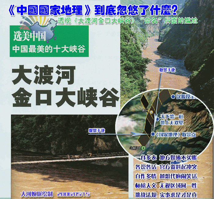 “金口”虽然来源于“金口河”,但它并不等于行政区名“金口河”,而是采用了从意象借地名的命名方式。作为一个外来的工作者,不可能有囿于某个行政区划的意识或观念上的偏见,而是从“行政辖区局外人”的客观中立的角度,从最有利于宣传推广的角度来考虑命名问题。而且也是希望通过对大峡谷景观的推介和国家地质公园的建立,为当地不同行政辖区内的所有民众造福。