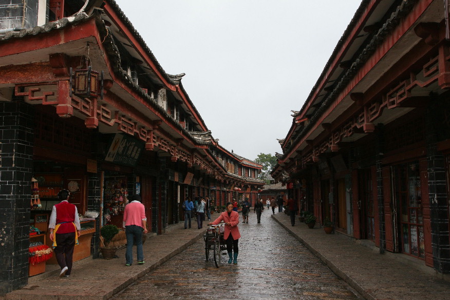 按照一些依稀的印象向拉市海的方向走,可走了不远,就找不到方向了,刚好看到有警察GG在路边,于是上前询问,警察GG是个大好人(hehe……),非常详尽地告诉了俺怎样怎样……走。在继续向前走了有十几分钟后,见到前面有一个红衣少年也在骑车向前飞奔,但是从穿着打扮来看不象是游客,更象是当地人,没有与他搭话,很快地超过他继续向前骑行,可没过一会儿,红衣少年竟然从后面赶上来又超过了我。就这样,一会儿我骑在前面,一会儿红衣少年骑在前面,当骑到一处岔路口时,我刚刚准备向那个大的路口骑去,红衣少年叫住了我,“你是去拉市海吗?从这边走要近很多!”就这样,两个人终于有了接触,开始边走边聊天(近路坡度太陡,无法骑车,只能推车前进,但路程要近许多)。通过聊天知道,红衣少年别看年纪小(也就十八、九岁的样子),却也在古城里有了一份自己的事业——卖旅游纪念品+出租自行车,对自行车的品牌、质量很有了解,告诉我“下次再租自行车时不要租这个,要租XXX牌的(忘记是什么牌子的了,只记得有GIANT)。”