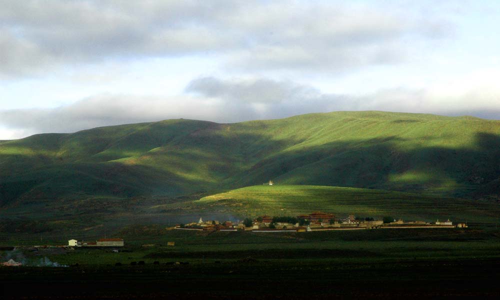走出尼舍不久,看见桑曲卓玛追了上来,我们的女记者向她伸出手,牵着她,走向大经堂。我看见山下的白塔被涂成了金色,夕阳下的草原让人有一种醉意,有想要唱歌的欲望。娜姆牵着卓玛的手,在歌声中向她和她的寺庙告别:遥望纯净的天空,想起一首古老的歌,那是妈妈,唱给太阳的歌……。大经堂前的空坝上,在附近念经或聊天的尼姑们听到她们的歌声,渐渐围了上来。向一大群人告别,嘴里说着客气的话,心里却有一种淡淡的忧伤,我发现娜姆牵着卓玛的手竟也不愿松开。不得不走了,我们匆忙上了车,车窗外是好多挥动着的手。我摇下车窗,向卓玛及所有的尼姑们伸出手去,作最后的告别。车动了,手松了,心里却生出了牵挂,我突然意识到,有一天我还要回到这里,因为卓玛抑或是田宇。我们的车沿着小路下山,转弯的时候,我看见卓玛抑或是田宇还站在高高的坝子上,挥着手,目送我们离去。尼姑寺最终离开了我的视线,而前方,渐渐靠近的阿坝县城,格尔登寺高高耸立的白塔正承接着最后一抹夕阳。