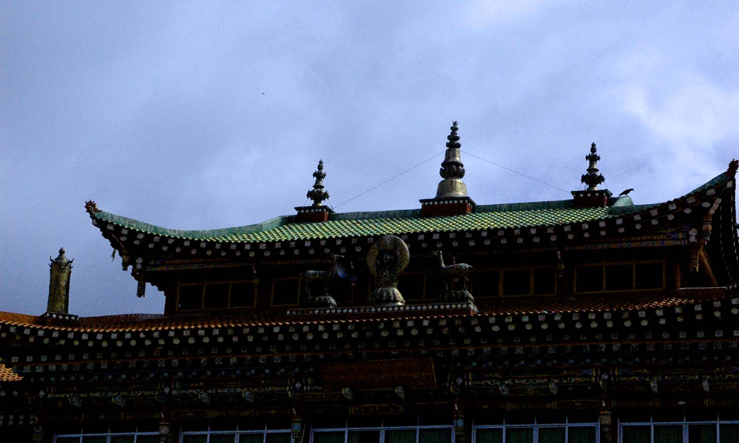 在得知这一情况之后,我大胆地与这位会说汉话的姑娘攀谈开了,起初她很不自然,随着交流的深入,她开始漫漫地放松了。当我问她去年春节似乎回过绵阳老家?似乎在成都被汽车撞倒过?她开始显得非常紧张,但当我告诉她不是为了其它原因,主要是对方想知道受伤者的伤似乎完全痊愈。她这才打消了顾虑。后来我们了解到,她就是田宇,杜丽是她的入寺时的汉族名字,桑曲卓玛是她的法名。正是因为那场不幸的车祸,使她躺在成都的医院里而没有参加去年的藏戏表演。虽然没有参加演出,她也同样为姐妹们高兴,因为这毕竟是她们一年一度最重要的活动之一,附近的老乡们都会来观看,热闹如同过节一样。尼姑们的表演栩栩如生,剧情引人入胜。那些妇孺皆知的古代人物和历史,在悠扬的乐曲中,在这样特别的布景下,一幕一幕地上演,让他们活在一个故事里被传说着。这里是阿坝县最大的尼姑寺,有尼姑三百人左右,除了主要学藏传佛教显密二宗外,还要学历史,文艺和语言一类的知识。所以她们每年要排演大大小小的剧目。正如朋友说他对这屋子里的感觉就象是来到了女大学生宿舍一样。她们在这里学习,修行,无忧无虑,平静而快乐,就象我们的大学生活。还有她们的舞步歌谣,浅吟低唱,仿佛是一种诗意的献礼,为今生,更为来世。有人说有信仰的人是幸福的。他们有所寄托,有所期盼,有所敬畏,有所满足,有理由让一切不如意都得以释怀。他们淡泊,超然,优雅的气度是留在我心中的一个深深的印象,那境界,我象永远也无法达到。当太阳的余辉将河谷对岸的山坡染成了红色,是告别的时候了。尼姑们站在屋顶的平台上向我们挥手再见,逆光中她们的剪影非常漂亮。