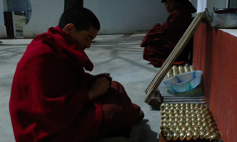 很快,我们的车就在经堂前一个开阔的坝子上停下了,县电视台的记者们快速地架起了摄像机。而我却带着照像机在经堂四周蹓跶,任目光信马由缰,极目处连绵的雪山,积雪尚未融化。河谷里还有一个环绕着白塔的村落。阳光借着云朵玩起光与影的游戏,如舞台的追光灯一般,一会儿亮了白塔和村舍,一会儿又亮了远处正在耕作的牛群。我有种恍若隔世的感觉,四周静穆庄重,但宛若听到了那来自天庭的梵音。就在县电视台的记者们开机拍摄和录制外景同期声的时候,渐渐地有一些小尼姑们围了过来。由于电视台拍摄节目的记者们大都懂藏语,于是他们便随意地打着招呼。我在旁边观看,发现这些尼姑们的年纪都不大,十几二十岁,目光中全是可爱的单纯,充满了好奇。大方一点的,回应着记者们的问候,害羞的则在我们目光接触的霎那躲开了,藏到伙伴的身后,或扬起衣角遮住自己的脸庞,但旋即又露出眼睛看着我们,目光是躲闪的。我们就在这些小尼姑们的目光追逐下,沿着寺内尼舍间的小路随意地走着,不时架起摄像机和举起照相机拍摄着我们需要的素材。尼舍的墙面是用土坯制作的,在午后的阳光下,泛着一层温暖的金黄色。偶尔可以看到一株杨树从某间尼舍的院落里长出来,枝繁叶茂,树叶在阳光下闪着亮光。从房屋之间的空隙,可以看到远处的河滩地。