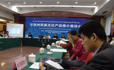 2006年24日下午,四川省第五届少数民族艺术节甘孜州代表团在嘉州宾馆举行了甘孜州民族文化产品推介座谈会。省文化厅副厅长泽波、省民委主任何晓平、甘孜州宣传部长王怀林、乐山市宣传部长罗佳明出席了座谈会,会议由甘孜州副州长胡斌主持。