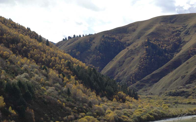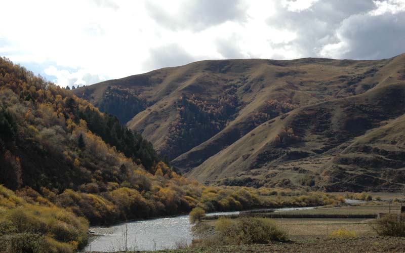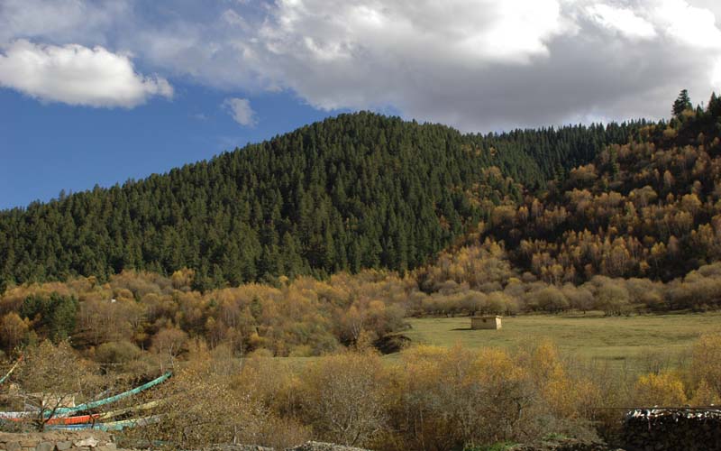 在这种自然深度里,让自己的灵魂和故乡神座相互融合,便能极尽所致的体味领略这遗落在亿万年间的秋韵了。于是用手摸用脚登用眼看用耳听用嘴尝用心体会用全身的血液和神经度量的也就是这故乡神座的秋了。可以伸开自己的五指来印在藏寨民居的墙壁上,红绿相间,雄奇崔嵬,这也许就是奔流于故乡父老乡亲们胸中的血性罢。可以迈开脚步,在与秋风的耳鬓厮磨里去登临村子对面的高山,一路登高,每上一层石阶,也便提升一种心境,此时可以把日常生活中的所有烦忧一股恼儿倾泻在这陡峭的秋里,只留下恬淡悠远在心间。可以张开乌黑的瞳孔去极力捕捉故乡神座的影子,看那层林尽染的壮美、秋日黄昏的辉煌、千仞绝壁的艰险。可以站在扎嘎沟的绝壁栈道上听林涛翻涌的澎湃、秋风低诉的呢喃、大雁南归的呼唤。其中,数这秋风最让人不舍,它总喜欢狂欢而来呼啸而去,环绕于身前左右,随着在身后让峭壁把那不带一丝烟火和尘埃的干净裁剪得更加有棱有角,铿然作声。也可以张开你干涩的口唇,顺手采摘一枚熟透的野果子,将其果肉放进嘴里,任香甜一直滑入你的心里,来滋润你久已干涸的心湖。
