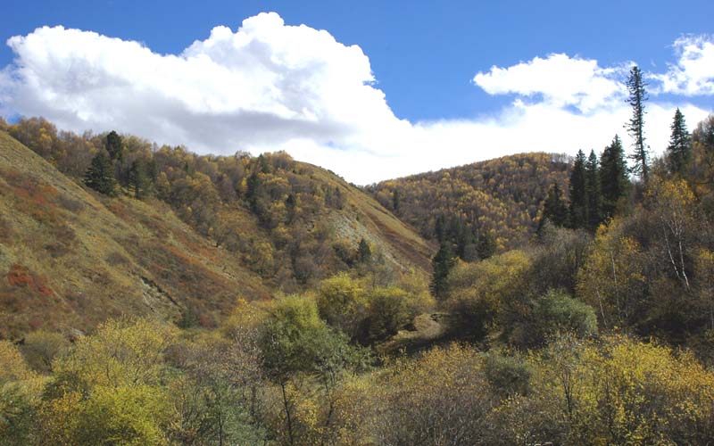 紧跟这娇艳和张扬之后,故乡神座一进入夏季,便开始庄重起来。这时,整个故乡神座的颜色逐渐由浅至深,一任那苍翠无边无际的伸展和延绵,仿佛广袤草原上的万马奔腾,形成一种席卷苍天的气势,恢宏而壮观。林立群峰之间,故乡神座的整体雄魂,无需过多的具体表情,只有低浑的歌吟,形成一种蕴藏在单调里的厚重,进而使人的思绪和精神健旺,跟着她的旋律流溢飞扬。但正因了这苍翠无边无际,过于庞大,便让人觉出一种过于浓郁的厚重,终是无法抵达极致。