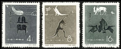 邮票图案:(131)蒿里山三叶虫(古生代)(132)禄丰恐龙(中生代)(133)肿骨鹿(新生代)
