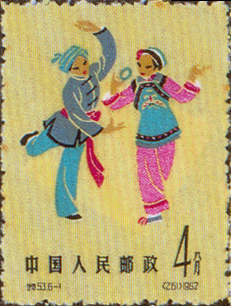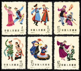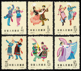 邮票图案:(246)汉族花鼓灯(247)蒙古族鄂尔多斯舞(248)壮族捞虾舞(249)藏族弦子舞(250)彝族朋友舞(251)维吾尔族手鼓舞