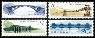 邮票图案:(252)赵县安济桥 (253)苏州宝带桥 (254)灌县珠浦桥 (255)三江程阳桥