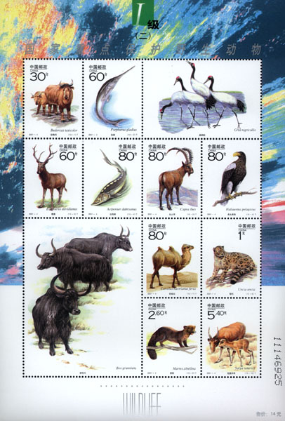 12、野牦牛(Bosmutus)偶蹄目、牛科。体形似家养牦牛,但更粗壮,颈下无肉垂,颈、躯干、四肢及尾部长有下垂的长毛,毛色黑或乌褐。头顶一对粗大的弯角向前翘起。栖息于海拔4000-6000米高寒地带,适应性极强。它借助自身的优势,以“高原之王”自居。野牦牛除交配季节外,雌雄分别活动。每年6月为产仔季节,母牛常结成大群,保护幼仔。遇狼群袭击时,母牛角向外,把小牛包围在圈中。母牛和小牛常在水草较好的山坡上活动,而公牛则三三两两或单独在山下平原地带游荡。国内分布于四川西部、新疆南部、青海、甘肃西部及西藏。模式标本1883年采集于甘肃南山东经95°北纬39.2°处(肃北县736300)。保护区有位于新疆东南若羌县与青海、西藏交界处的阿尔金山自然保护区(新疆若羌841800)和西藏羌塘自然保护区(尼玛县852600)。