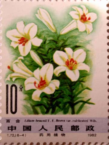 T·72·(6-4)图案描绘了药用植物百合的花茎、叶形象。绿叶白花,洁白无瑕,十分醒目。右合是早春花卉,中国民间把它称为“吉祥花”、“如意花”。百合的鳞茎供食用、制淀粉;中医学上入药,性微寒、味甘,功能润肺止咳、清心安神,主治痨嗽咳血、虚烦惊悸等症。