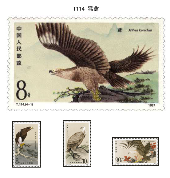 T·114·(4-1)图案是一只展翅欲飞的鸢。鸢是猛禽中鹰隼类的典型代表,俗称“老鹰”。鸢在田间捕食大量的鼠类、蝗虫、以及各种爬行动物、蠕虫等,也食小型鸟兽的尸体及残屑,有益于农业。