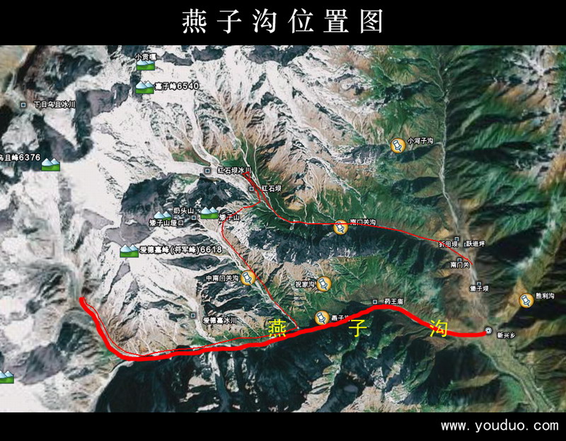 燕子沟有海拔5900m以上的山峰十五座。沟内有挺拔险峻、高耸云天的奇山异石,如:药王庙旁拔地而起,犹如一巨形竹笋直刺苍穹的竹笋峰;药水沟旁四座拔地而起的石笋直冲云天,形如正行进于取经途中的唐僧师徒的唐僧师徒石笋峰;朱家沟年轻少妇背着小孩焦急地盼望丈夫狩猎归来的望夫台;状如犀牛角独立群峰之中的犀牛角峰等,这些独具特色、千奇百怪的角峰群其形状栩娜如生.巧夺天工,犹为壮观。  沟内有多处矿温泉,水温在 20℃—45℃之间,属碳酸钠或碳酸氢钙中性温泉,水质无色透明,无异味和有害成分,以药于来为代表的优质矿泉水,被评为中国十六名泉之一。  八十年代初期至九十年代,日本、英国、加拿大、美国、瑞士、澳大利亚等国际登山爱好者十余次经燕子沟向贡嘎山主峰挑战,也未能征服它,燕子为成为了征服贡嘎山探险勇士们的登山基地。