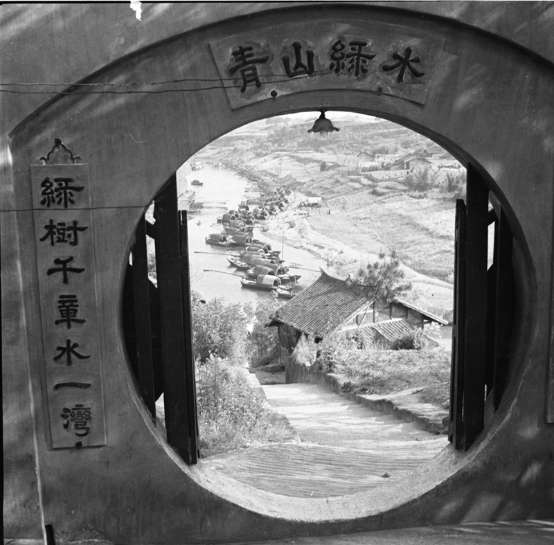 (釜溪河中的运盐船--歪脑壳船。岸边崖坡上可见“还我河山”的标语。)