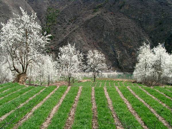 金川雪梨大有名气,这里独特的温热河谷气候与成都很接近,在金川种植雪梨也已经有很久远的历史了。在这里,不论宅前田间,不论河谷山川,几乎是处处都有梨花的踪影。有时,它们会几株或者十几株地聚在一起,小小的一片清新会让你心里感到点点的温暖,这些小宠儿们让你快乐,让你精神愉悦;有时,它们会几百株几千株地聚在一起,其中不乏上百上千年的古梨树。至少绵延80公里的景象绝对难得一见,这般规模和气势足以让你心里翻起由衷想赞美它们的欲望。面对着大自然这样神奇的造化,面对着万亩梨花归眼底的图画,也许我们会恨不得自己就是一只蝴蝶,永远徜徉其间。