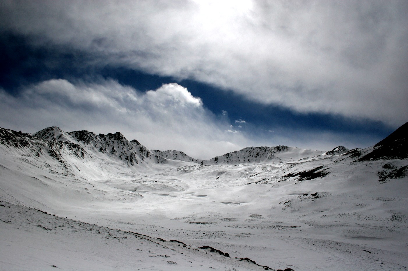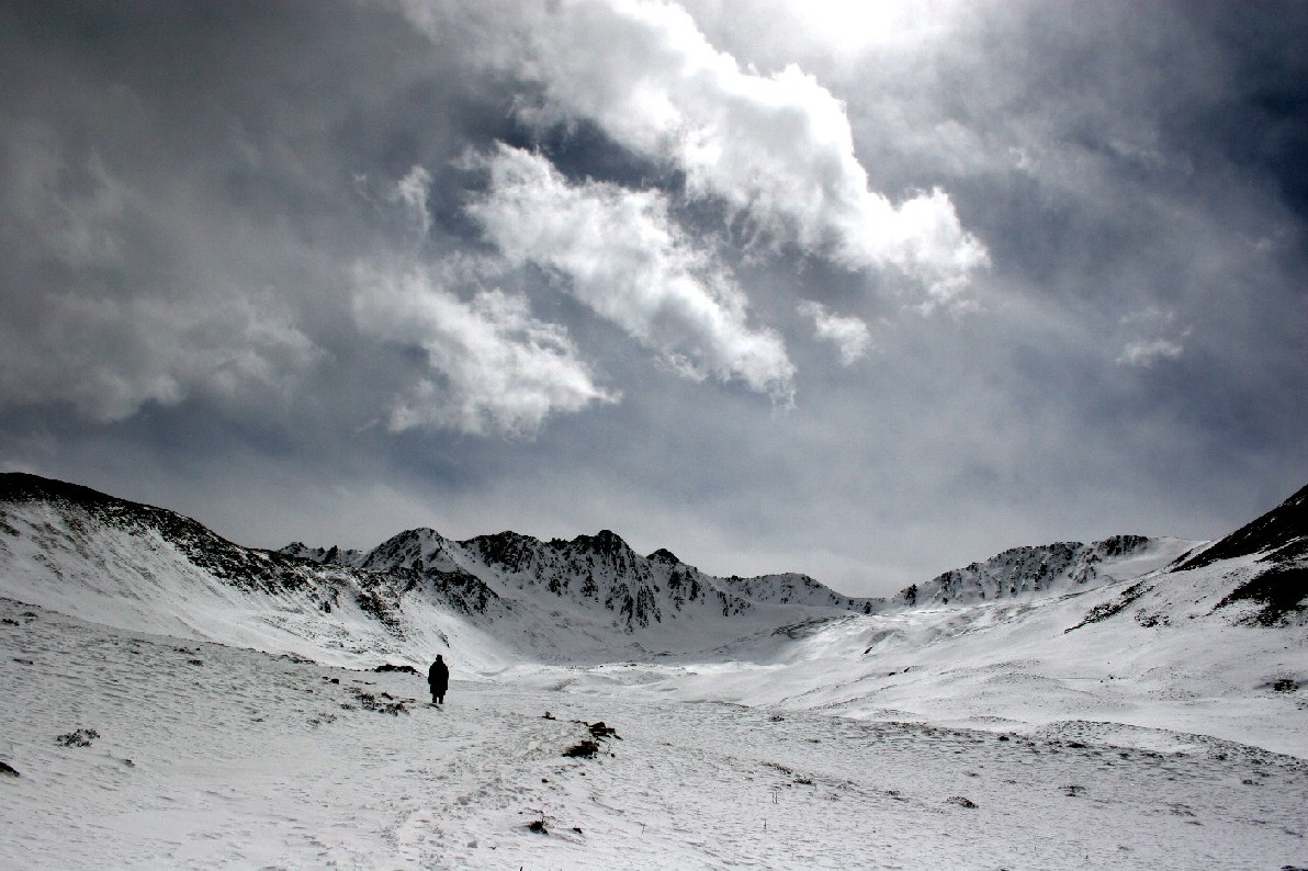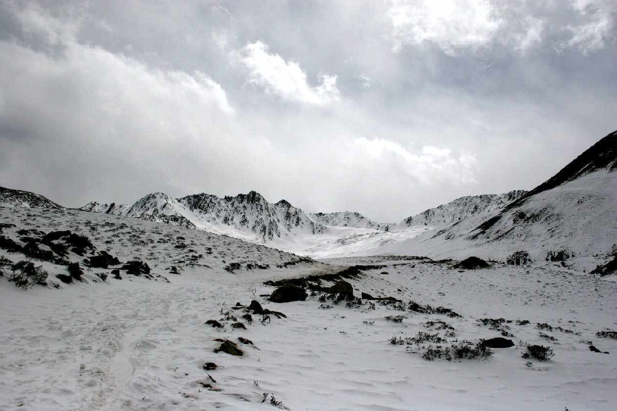 于是我们继续向上, 到达了一个雪山洼子, 洼子的下面是一个冻成了冰的海子, 它的形状象是一滴泪珠, 也许是木雅仙子的泪珠吧? 它的四周覆盖着一尺多厚的白雪, 白云从四面八方越过山顶涌下来, 有些飞云突然被冷空气冻住而结成了云团, 云团在山洼的稀薄空气里变得沉重突然下坠而压向海子, 四周是一片白色的光芒, 大风刮起雪地上的雪花, 在地面形成一层飘飘然然的白雾, 就在这时, 山后面的那座尚未露面的巨大山体推动了另一阵大风扫过峡谷, 空旷峡谷里风的吸力将云层撕开一条缝, 露出了蓝色的天空, 这里的海拔已经接近4500米, 在这样急剧变化的云飞风舞的世界里, 我头脑一片晕眩, 进入了一个云的梦镜。