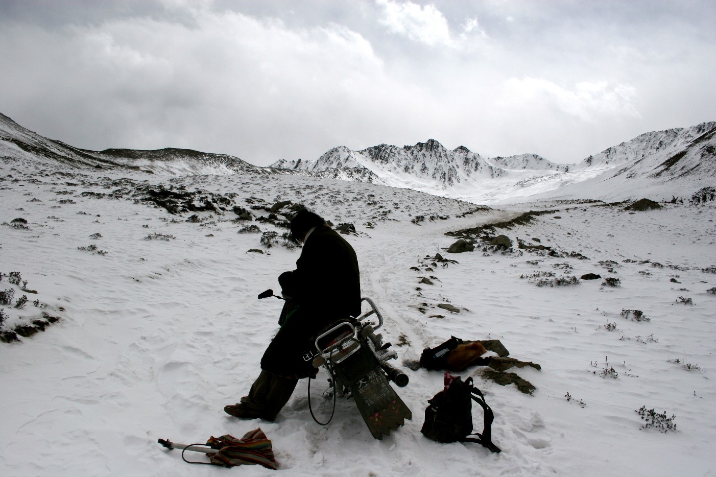 过了海子以后, 大雪变得更深了, 摩托车再也无法前行, 才让下了车毫无作用地将摩托车往前推, 我知道那时徒劳无益的, 于是我们停下来, 坐在雪地上休息, 时间已经是三点了, 我拿出白花花的康定馍馍, 风干牦牛肉和卤牛肉片, 分了一办给才让, 我们在雪地上就这样在缺氧的情况下干啃起来, 我打算向丫口发起最后的冲击, 我示意才让在原地等我, 但才让却说要陪我一起上去, 我早就知道藏族小伙是靠得住的, 他是不会让我一个人去冒险的, 贡嘎雪山对他来说同样也具有强烈的吸引力, 我有两罐氧气, 留下一罐在原地等需要急救时再用, 我揣上一罐, 没有忘记提起照相机就开始向上攀爬。才让几下就走到了前面, 我在后面, 一步几喘地慢慢跟着, 已经快四点了, 还有将近垂直两百米的大山坡要攀登, 抬头仰望那风雪弥漫的丫口, 心在下沉, 信心也在直线下降, 太阳眼看就要下山了, 一种焦虑袭上心头, 一个恶性循环已经开始, 唉! 一切都是为了丫口那一边的那个庞大的山影, 缺氧的难受使人好象在半醒半梦的状态里向上几乎是匍伏着前进。