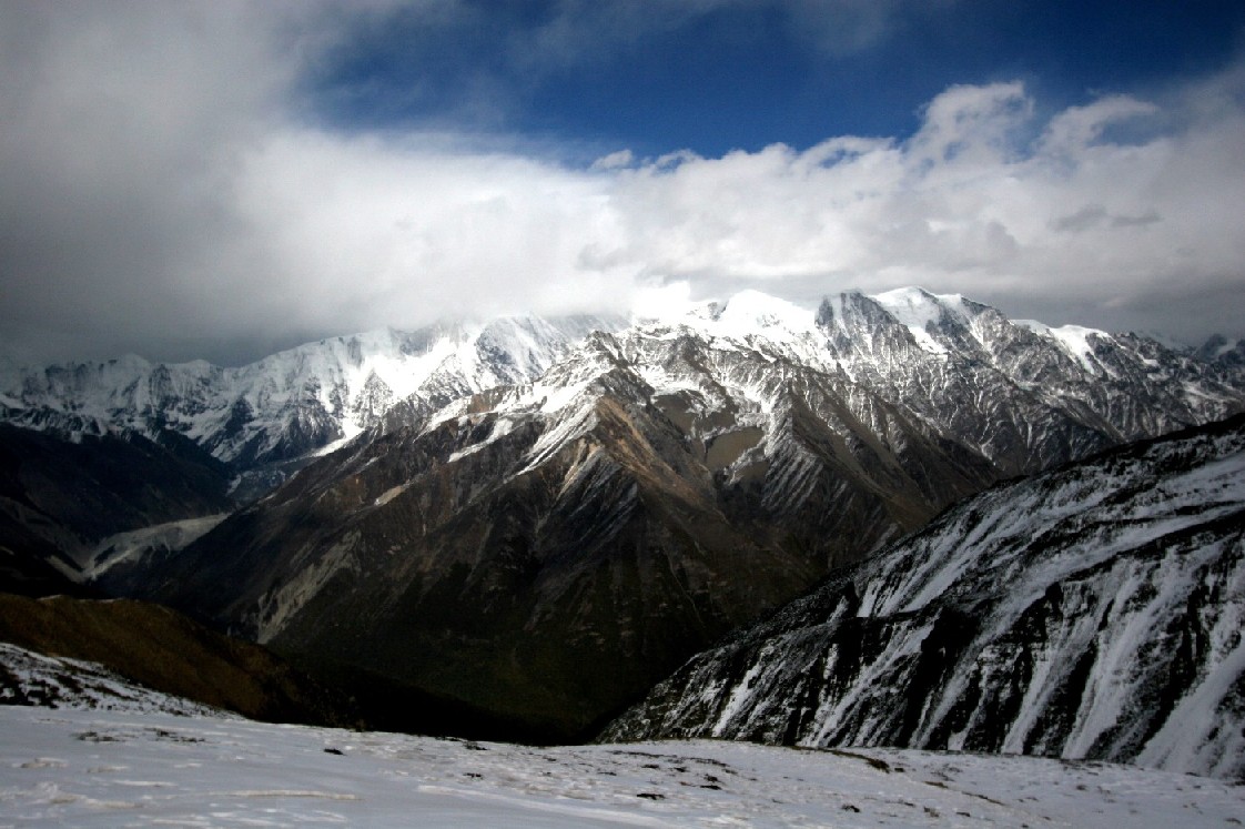 就在我们犹豫的时侯, 我们接近了一个山口, 一接近山口就感到有一种强大风力的存在, 对! 这绝不是一般的风, 只有特别巨大的山体周围的深谷才能产生这样大这样奇寒无比的风力, 毫无疑问, 这是贡嘎雪山的风力, 我们离它已经很近了, 隔着山峰我们见不到它, 但是从山顶上飞过来的云的形状看, 我们可以明显地感觉到那一边有一个巨大的山体在吸引和推动着这种象发射出来以后又开始飞翔的云层, 这一定是它! 这座具有强大神力的山向来人发出了邀请和挑战, 关键时刻已经来临。