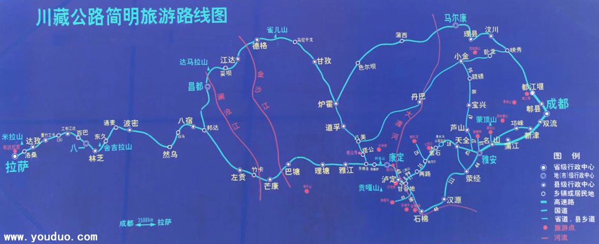 成都→147KM→雅安→168KM→泸定→49KM→康定→75KM→新都桥→74KM→雅江→143KM→理塘→165KM→巴塘→36KM→竹笆笼→71KM→芒康→158KM→左贡→107KM→邦达→94KM→八宿→90KM→然乌→129KM→波密→89KM→通麦→127KM→林芝→19KM→八一→127KM→工布江达→206KM→墨竹工卡→68KM→拉萨