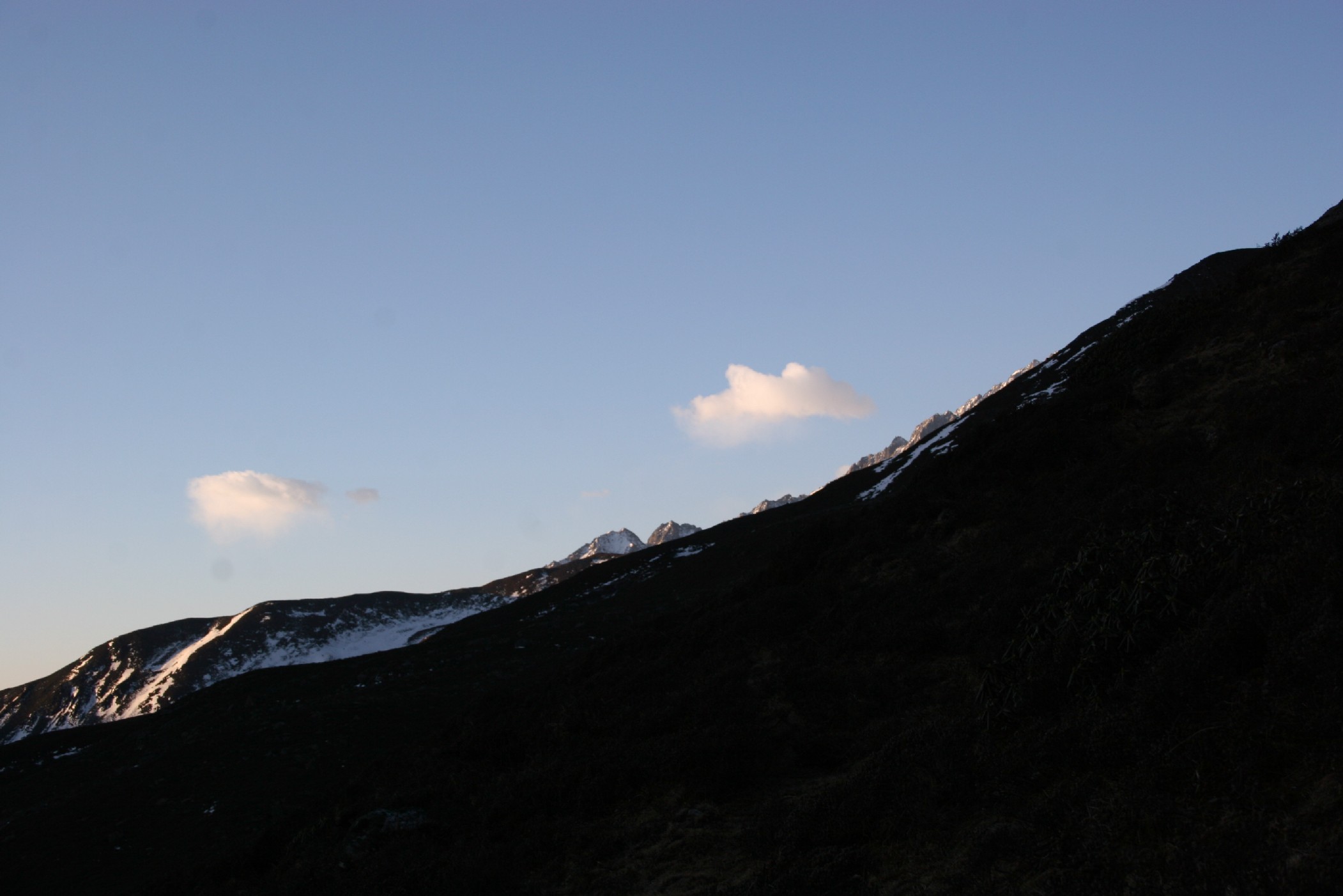 难怪这里是训练高山向导的基地, 因为它是对耐力和判断力的一个考验, 我一口气上爬了三个小时, 而前面的高坡却不断向上延伸, 似乎永远没有尽头, 把前面山与天空交接的那条直线当作山顶显然是错误的判断, 那条线总是随着你的上攀往上移动, 你一上去, 它又到了前面, 更糟糕的是, 上面还有一些高峰, 在下面看不见, 上来了才见到它挡在了你的面前。我不用报名考试就自己来给自己训练一番, 而且不用受到教练的虐待,虽然冷清一点,但还是有几分自在。可惜虫草还没有长出来,要不然弄几根补一补没吃早饭的身体,百分之百的吸收了,晚上一定有劲没地方使!