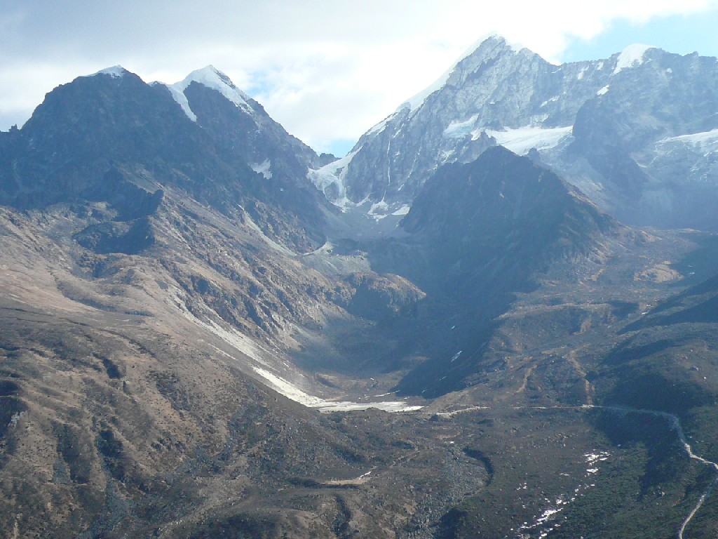 对面的玉岭雪山傲然屹立, 各种云团从她头上飞过, 她山腰上的一个小海子冒着白烟! 一条小小的冰川挂在海子的上方, 那里曾经有三个四川德阳的山友遭遇雪崩而亡, 他们的灵魂而永远安息在那荒漠冷僻的山崖上。这个看上去十分恬静的小冰川,怎么会这样的危机四伏呢? 也许是隔得太远, 看不清她的真面目,一旦走近,就真相大白吗?