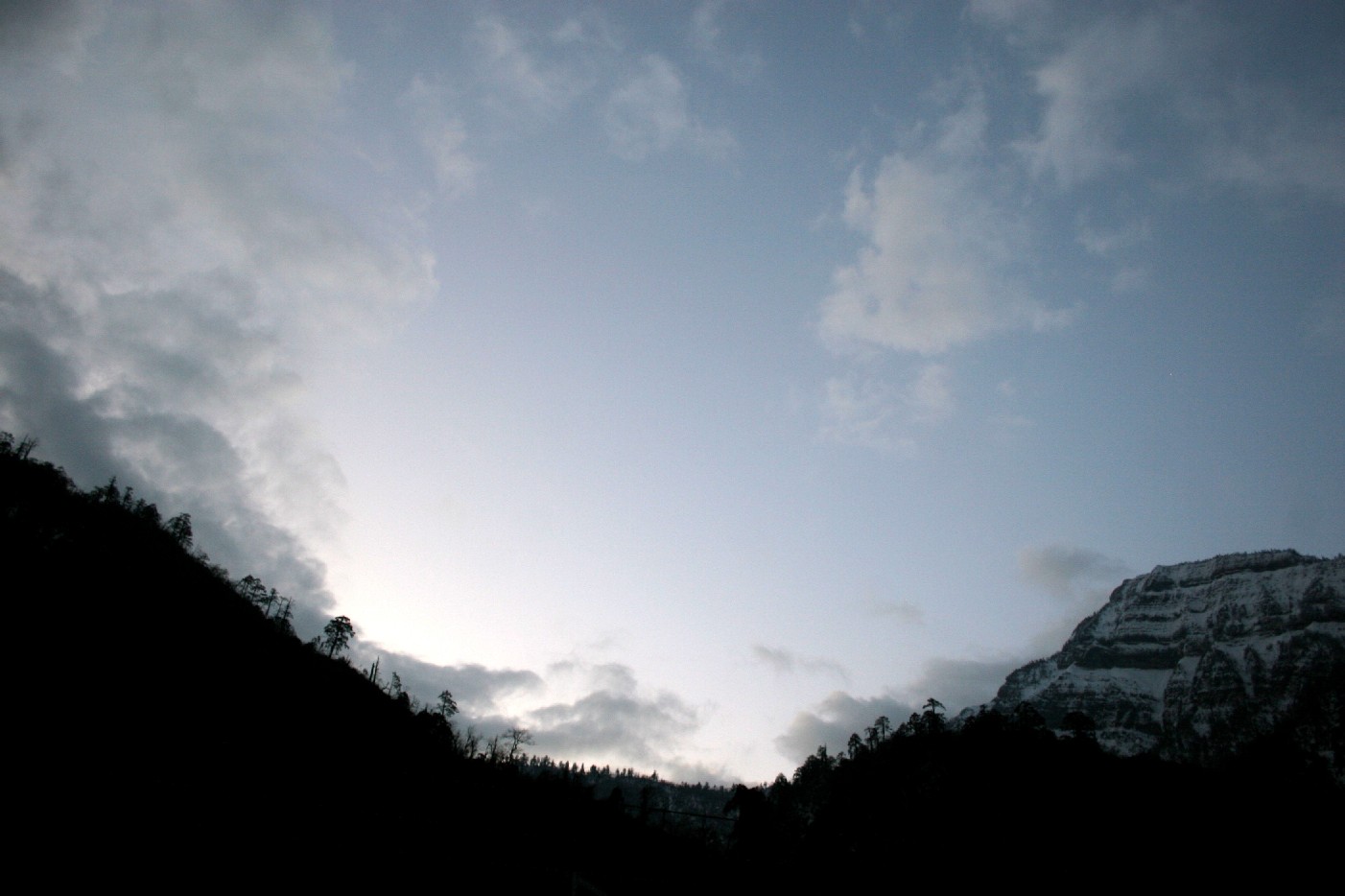 最后一丝夕阳已落在了贡嘎山的西边, 天空骤然变成了一中蓝中透黑的夜晚, 山林里更黑暗了, 小路慢慢变得模糊了, 我们已经远离了喧闹的川藏主干道, 在这种封闭隔离的山野里, 什么都可能发生, 但什么都没有发生, 发生的只是神经质的发作, 猜想与怀疑之间可笑的过敏, 小伙子无非是想在天黑前再赚二百元回家, 他的哥哥却有点不放心不知他单独一人拉的什么人这个时候独自上山, 所以不断打电话上来, 我虽把二郎山的主峰幻想成了自己的情人去偷偷幽会一次, 其实只不过是想满足一下将情人的美貌和恫体用晚霞沐浴后,而永远占有在照相机的存储卡里的简单欲望, 也没有什么想抢车害人的动机, 哪里来的这么多胡思乱想和疑神疑鬼呢? 人之初, 性本善啊, 只因为幽会情人就一下大家都变成了十恶不赦的坏人了吗? 人心狭窄得真实可笑啊, 我和小伙子心照不宣, 互相知道大家都不是坏人,但不管怎样, 双方的手机都拿在手里,好象只要一按手机天兵天将就会从天而降似的。