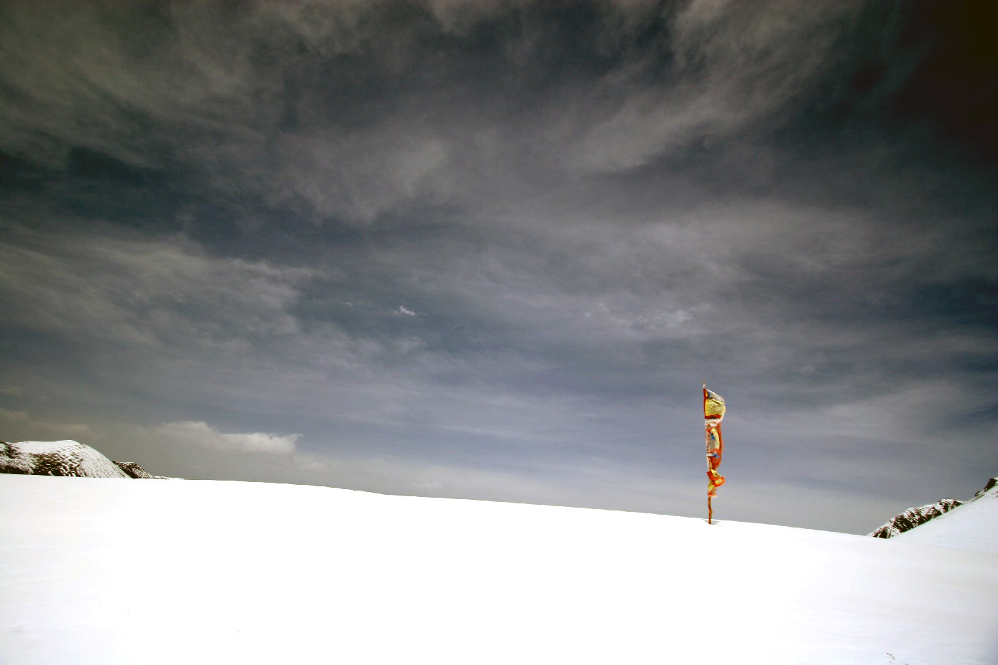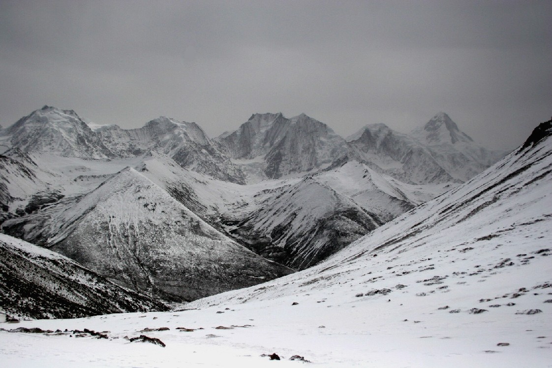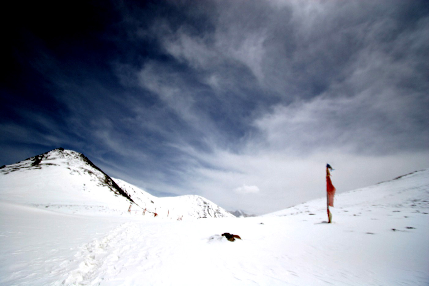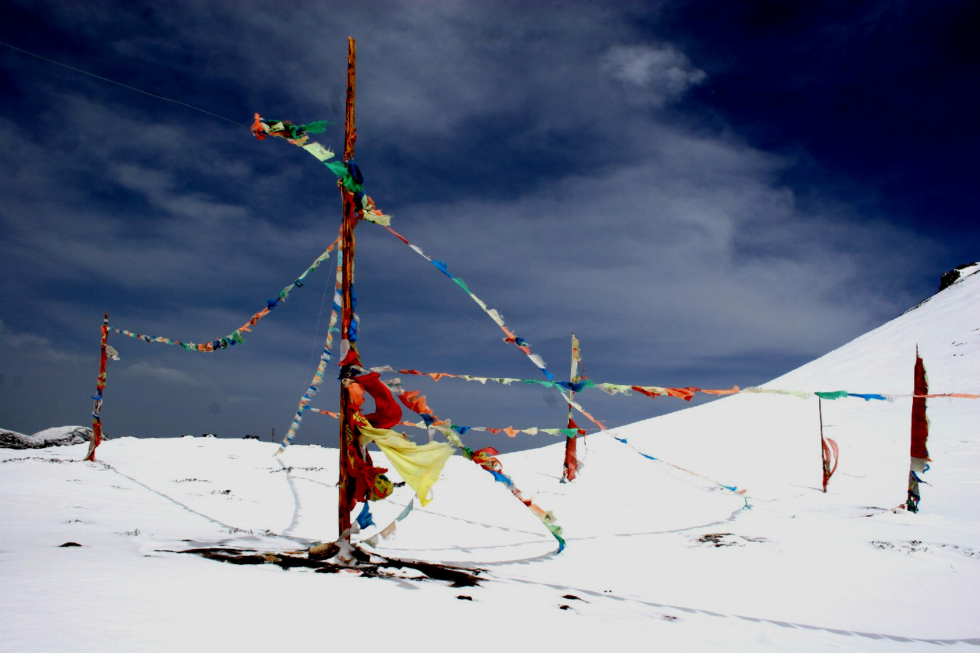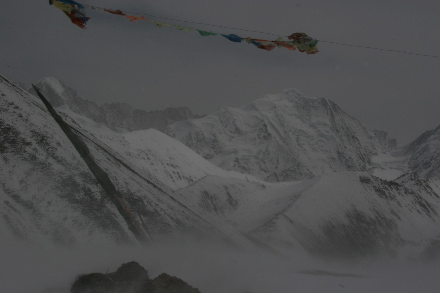 正午过后的峡谷风会越来越大, 它们到达5千多米高的丫口时至少也有七八级的风力, 丫口上除了几根经幡以外, 全是光滑的雪坡, 稍不留意就会被扫下峡谷, 我定下神来在周围看了看, 好在此时已是四月中旬, 丫口上的雪坡表面上只有一层薄薄的冰, 用脚使点劲, 可以在雪地上插进小腿的一半, 这样足以在狂风中稳定身体, 不至于被扫下空旷和深邃的峡谷, 于是, 我打定主意,在近乎雪盲的状态下, 顶着不断击来的雪粒, 用双脚对着雪深的地方捅出一条路, 连滚带爬地逃离了丫口, 一头扑在了丫口边的一片深雪地上, 这里的风速已经大大的小于丫口上的, 这里已经是安全地带。