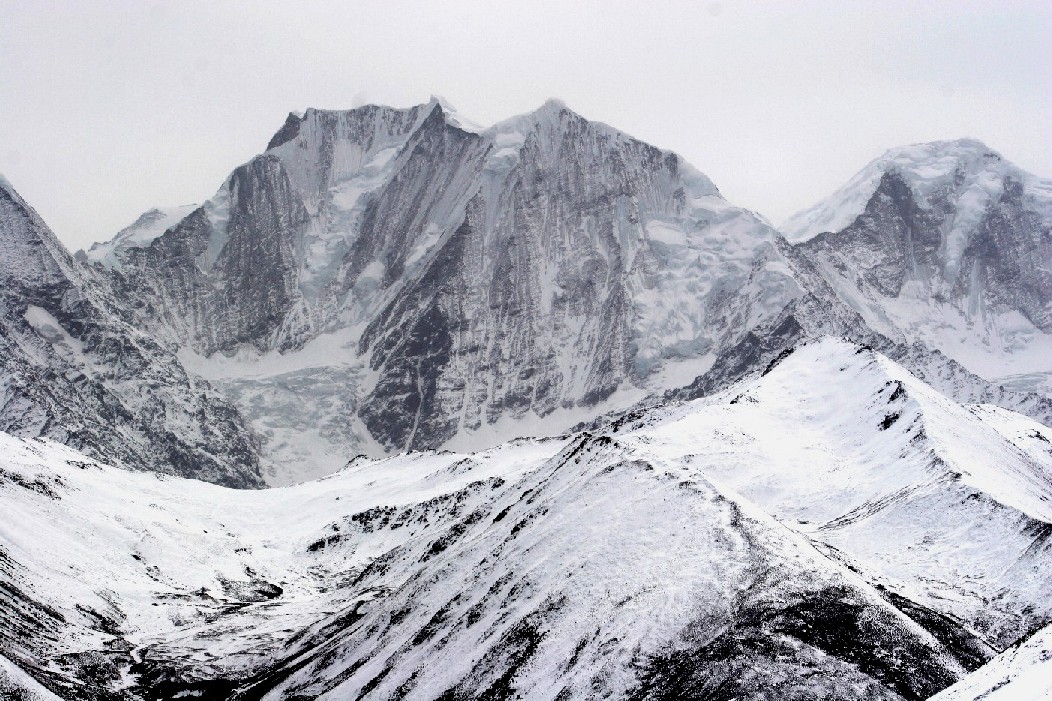 在丫口的那一边, 贡嘎雪山主峰巍然屹立, 它斯文不动, 怒号的狂风, 翻卷的白云, 飞扑而来的雪粒, 使神山更具英姿, 更显风采, 白茫茫的雪山啊, 我真的是没有办法看个够, 他近在咫尺, 但却仍然遥不可及。我就算站在了他的面前, 他仍然还是那般永恒的遥远和高大莫测, 我的照相机无论怎样搬弄, 他总是以黑白两色出现, 如此清晰的雪山本色, 不管是风和日丽, 还是狂风暴雪, 它们对雪山的本质不起任何作用, 在任何情况下, 他都一样美丽, 永远壮观!