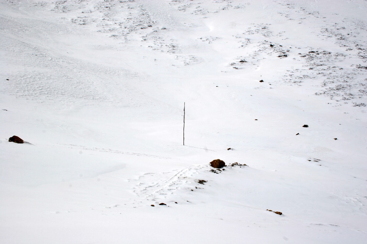 山坳里一根经幡, 处于雪深风大之处,已经只剩下一个竿子, 仍然直立不动, 凭着他的影子仍可以确定方位和方向。