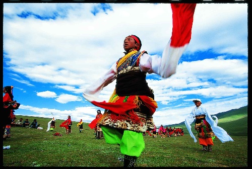 赛马,首先以煨桑揭开帷幕,这种燃柏烧香,敬神祭祀的古老习俗,源于笨教。笨教崇拜自然,人为万物具灵,从具体事物中,抽象出一种无所不能的“神灵”来敬奉。笨教兴盛时期,吐蕃初民身处倥侗,每当出战,都要以煨桑形式祭祀本族“神灵”,祈求保佑。今天这一形式既是古老习俗的沿袭,又是民间赛马竞技的开场仪式。对于严阵以待的骑手们来说,煨桑如同古战场上的烽火,他们一见狼烟起,便飞身跃上马背,从四面八方涌向中央赛场,举行隆重的集体煨桑仪式。当几百名骑手,有的挎弓佩剑,有的背负叉子火枪,有的摹仿吐蕃骁骑,有的扮装成近代藏兵,按着宗教仪轨围着冲天祭烟绕圈时,那威风凛凛、不容侵犯的英气,令人联想起雄狮格萨尔王当年率兵出征的悲壮情景,也给赛场披上了古老而神秘的色彩。煨桑后,接着便是马术比赛。比赛由跑马射箭、跑马耍枪、跑马悬体、跑马拾哈达和长途赛、走马等民间传统项目组成。跑马射箭,是一项幕仿古代骁骑的竞赛项目。参赛者身着吐蕃时期的戎装,腰挎箭筒,手执硬弓,在奔驰的骏马上。弯弓射靶,以命中率决出名次。跑马耍枪,是一项饶有趣味的传统竞赛项目,颇具观赏价值。它有整套规定动作,要求骑手在有限的赛程内完成,并讲究套路,动作要连贯,姿势要协调。骑手首先从背后取下叉子火枪,用左手举至头顶,顺时针方向转圈;接着将枪支从身后递至左手举到头顶,然后逆时针方向转圈,接下去要从马脖子下把枪传至右手射递靶。骑技高超的骑手,不仅能出色地完成规定动作,还能不落俗套、匠心独运地从坐骑脖子射靶击准。如果骑手动作迟钝、姿势笨拙;或者骑手跑出了射程,无法射靶,甚至出现哑火等现象,他们的身后便是一片喝倒彩的声浪。 在众多的马上竞技项目中,赛马拾哈达的角逐场面最为激烈。竞赛规定参赛骑手要在疾驰的马背上,把横放在跑道两旁的数条哈达拣回,依据所得数量,决出名次。如在比赛过程中,以匹减速或者停顿,所得哈达就不能算数。跑马倒立和跑马悬体,是两项既精彩又惊险的民间传统马术表演项目,有时纳入竞赛项目。跑马倒立,动作并不复杂,但难度很大。它要求骑手身穿轻装,脚系彩带,在驰骋的马背上稳稳倒立。具体作法为骑手紧握马具肚带,肩靠马脖,下肢朝天。裁判将视其倒立时间长短、立姿曲直评判分数。 跑马悬体堪称民间马术绝技,它要求骑手,在奔驰的骏马上,用脚尖紧勾马蹬,全身仰面悬挂于坐骑侧面。此时骑手头部几乎接近地面,场面极为惊险好看。参加跑马悬体的选手,通常脚蹬长筒藏靴,睛着白色长藏衫,外披一件用绸料编织的五色绊胸索。当骏马拖着骑手飞驰时,迎风屑的长袖和绊胸索象朵五彩飞霞,令人赏心悦目。