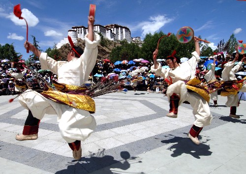 当日上午,来自西藏日喀则、山南等各地的藏戏表演队、格萨尔说唱艺人聚首在布达拉宫脚下,载歌载舞,吸引了众多当地的市民和游客,让他们近距离感受到了极具地域特色和民族风情的西藏民间文化艺术表演。
