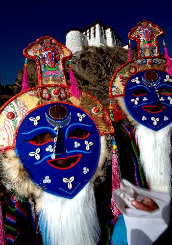 (6月9日,两名藏戏演员在迎接四方来客。)