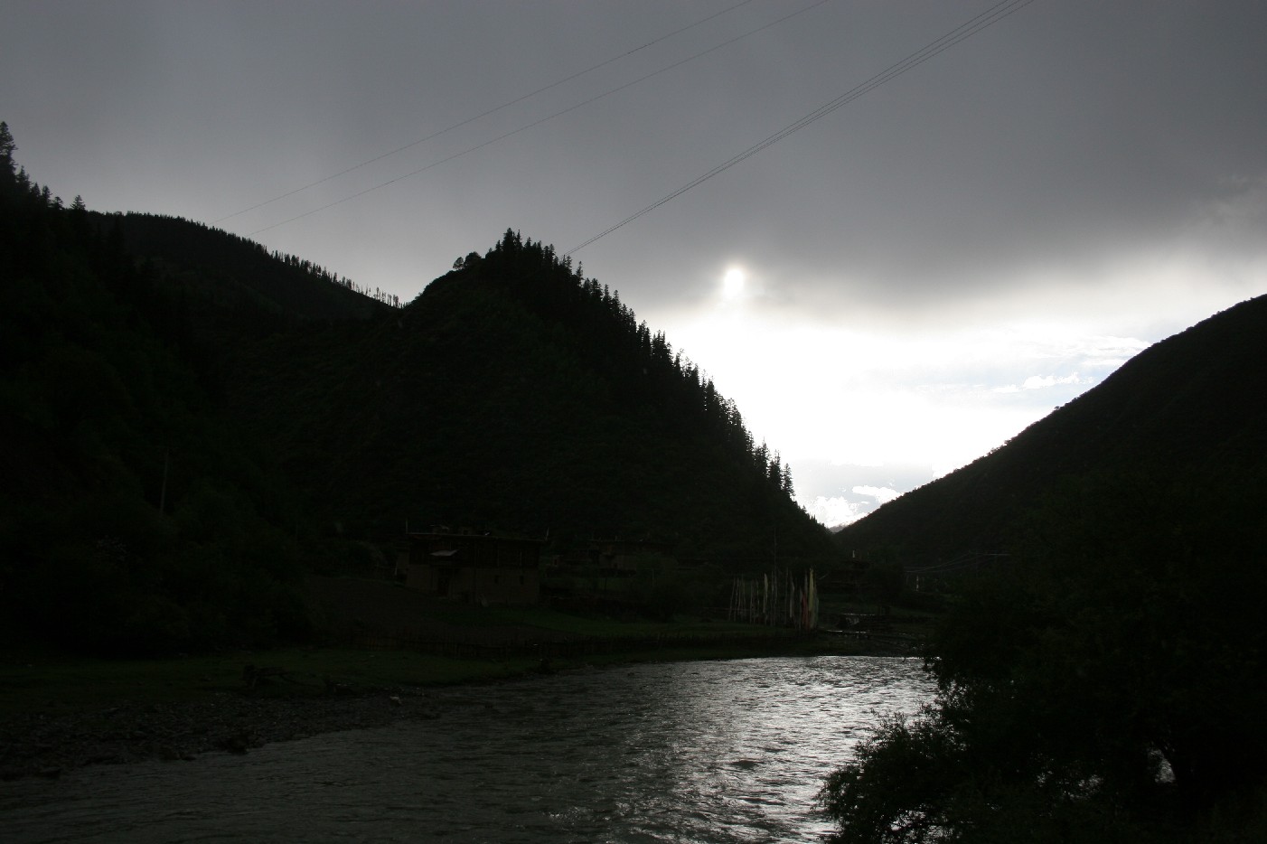 前往白玉的路上,冰雹云遮挡了太阳,使它看上去象月亮一样,前方的白玉则是阳光明媚,向往之心, 越来越迫切,顺着"月光"下的偶曲一直向前,前方就是建设镇(地方和地名,一座历史的丰碑,一个文革的记号)。