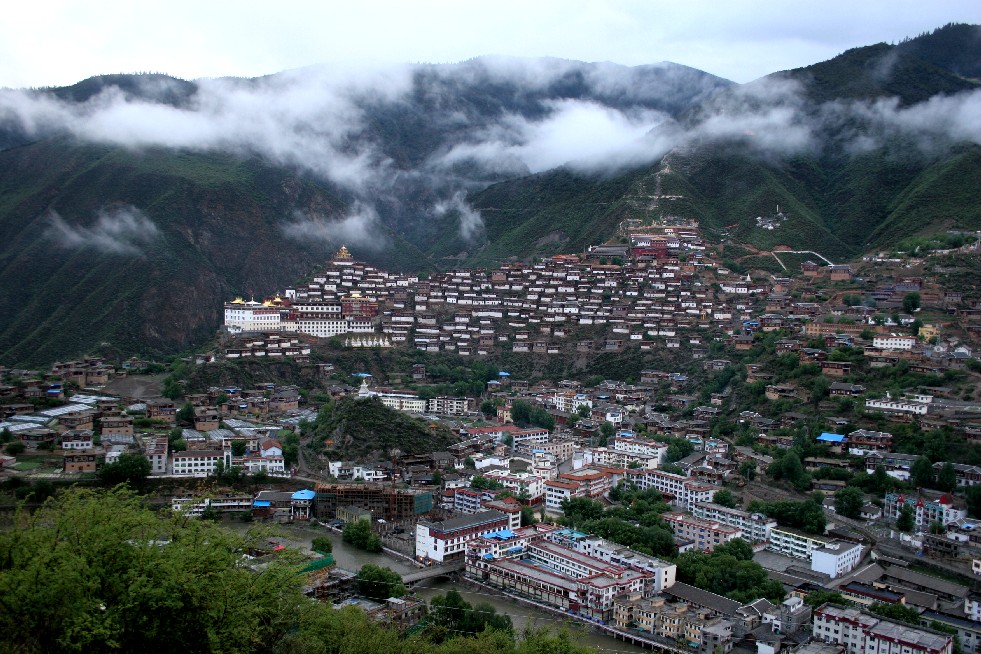 街上什么也看不见, 但随时可以感受山上白玉寺那联成一片的寺庙建筑和喇嘛觉姆的住房的宏大和威严, 那个神圣的实体注视着整个县城, 在城里的任何一个角落, 都可以瞥见那片建筑群的一角, 世界上没有哪一个地方将城市, 村庄, 寺庙, 山沟如此地结合成一个整体, 而且让一条奔腾而宽阔的河(偶曲)从中穿过, 从城的一端流入, 从另一端流出。