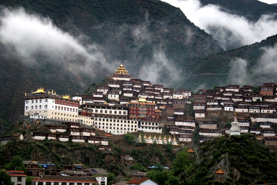 我抬起头, 只见身后的山上, 一片玉一样的白云翻过山顶, 朝山下卷过去, 它们越过偶曲, 向着寺庙庞大的建筑群扑过去, 一会儿就掩盖了半边山, 眼前的视野变成了一个迷惘的水彩画面, 再过一会, 一丝阳光透过云层, 直射白玉寺的金顶, 早上八点, 城市终于醒过来, 街上出现了卖菜的人影, 山的那半边寺庙外, 红色的斑点在山坡上蠕动, 喇嘛们纷纷走进经堂, 开始了一天的修炼。
