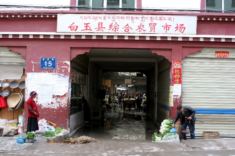 已经八点了, 司机还在睡觉, 更糟糕的是, 他的捷达车根本不可能开进盖玉, 昨天晚上吃饭时, 老板一口断定的, 我想肯定也是进不去的, 看来捷达今天可以休息一天, 我还得再去包车, 叶巴这个地方在我脑子里已经装了七八年了, 它一直是我的一个向往, 前两次来白玉根本没有办法找车进去, 当时两次都遇到了滑坡和泥石流, 这一次无论如何也要进去, 于是我下山进了城, 过了桥, 来到菜市场边的丁字路口, 这里停了一大排面包车, 司机们坐在里面, 等着象我这样的人来包车, 他们去的都是些小地方, 最远的也不过是噶陀寺, 最近的是滴水岩, 金沙江在与偶曲交汇的地方稍微拐了个弯, 离城八公里, 他们就说那里是金沙江第一湾, 鼓捣着要带我去那里一揽大江的雄姿, 我不以为然, 这里算是金沙江第一弯的话, 那奔子栏那边的真正的金沙江第一弯怕是要笑掉牙了。