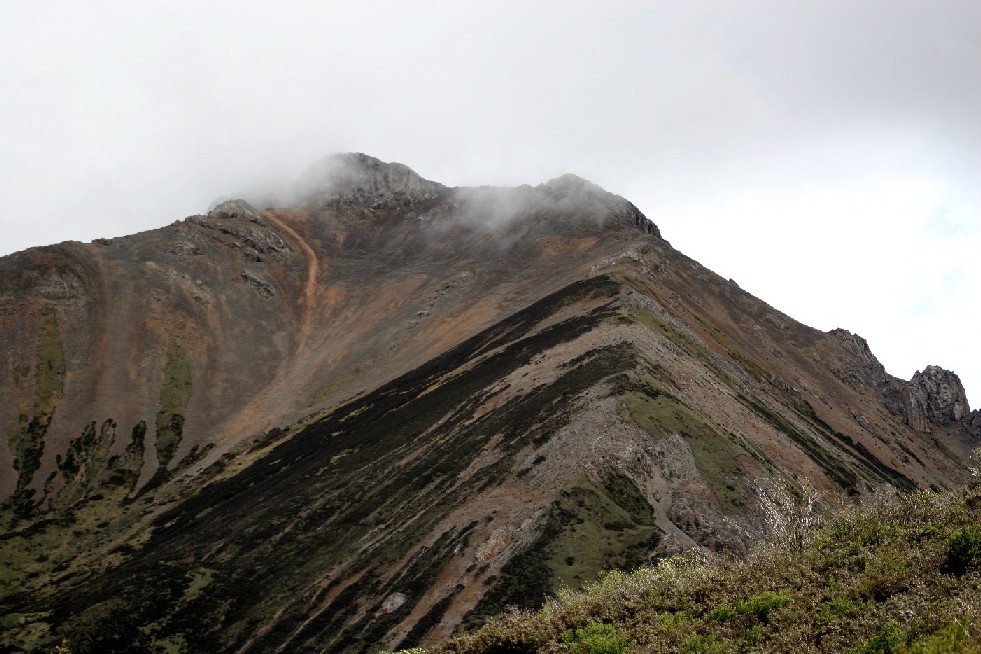 在米拉山的丫口上, 我们被对面掩藏着迷雾之中的盖玉方向的一座大山的苍劲和荒蛮所震撼, 这就是叶巴所在的, 海拔5074米的娘夏卓山, 可惜照相机没有能够拍出那种效果来, 更令人惊奇的是, 回来仔细看了长镜头拍的照片才发现的, 原来这两座山的主峰都是近代的火山口, 从峰顶流出的溶岩表层的光洁度来判断, 这两个火山口最多不过数百年的历史, 不过这两个火山口喷发时的力度有限, 溶岩流到半山腰就停止了, 但无论如何, 这似乎是此次进山的一个新的发现(如果别人还没有发现的话), 90年代出版的白玉县志上并没有提到这两个火山口。