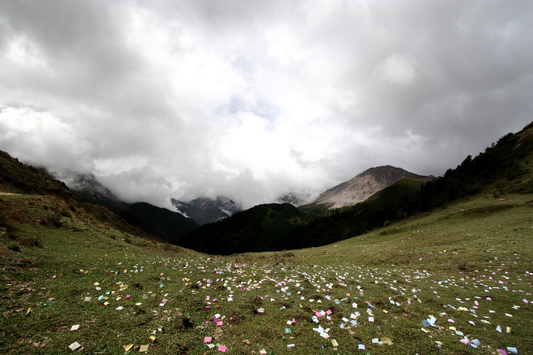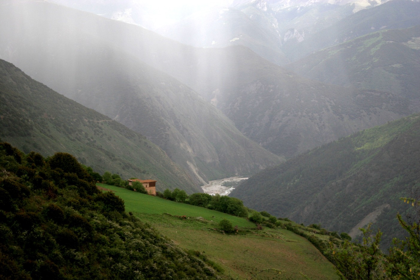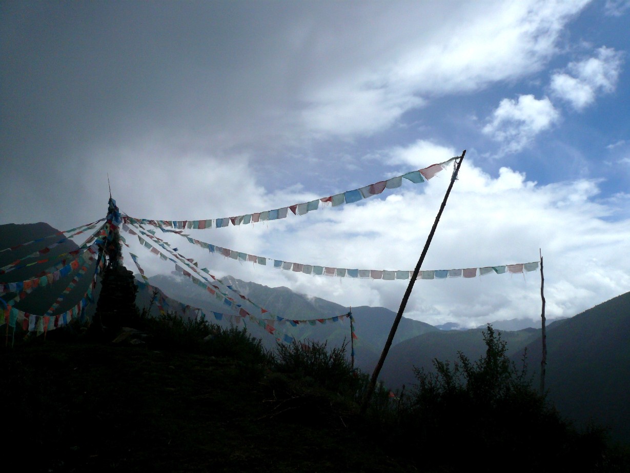 大雨停了, 峡谷又安静下来, 阳光透过云层射向了峡谷和悬崖上的小路, 我从沉思中回到现实, 抬头望见叶巴村头面对大江拐弯的山头上, 有一个由村民们立的经幡塔, 那是为纪念在叶巴险滩遇难的三位勇士而立的纪念塔, 也是村民们为祈求大江的风调雨顺而立的经幡塔, 在雨后的霞光里, 这个具有强烈象征意义的经幡塔, 以庄严和撒脱的姿势面对峡谷, 仰望天空, 俯瞰大江, 她们在山口上迎风飞舞, 展示出一种独特的边关意境, 他们日夜祈祷, 歌颂着那些曾经为了理想而英勇献身的英灵!