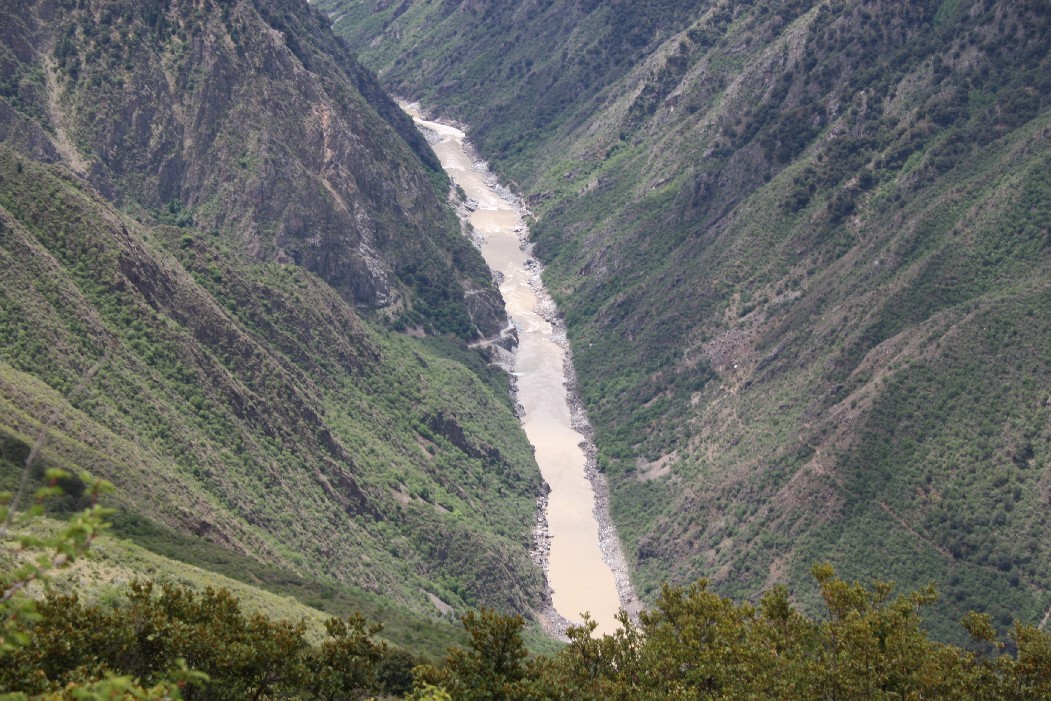 穿过叶巴村就来到了峡谷口, 这时候, 我难以掩饰内心的激动, 六月的江水虽然不大, 看不到长漂英雄们所描写的那种大跌水, 深旋涡, 和卷皮浪, 但是那峡谷, 却是依然让人感到山河的骄傲和伟大, 金沙江在叶巴村旁拐了个近九十度的弯, 形成了一个宽阔的峡谷空间, 金沙江在这里来了一弧形的转弯, 从山顶看下去, 一切正如当年的长漂英雄们所描写的那样: