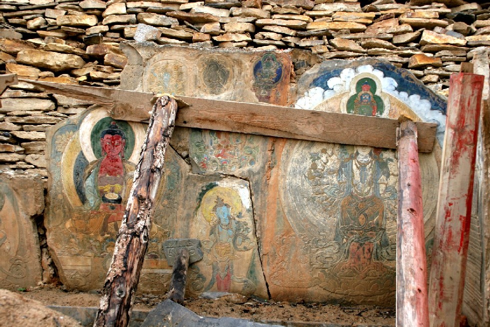1986年, 阿秋喇嘛在觉姆寺旁修建亚青寺时, 牢记了师傅的嘱托, 让人将壁画连带石墙一起拆了下来, 修建了一个有八百万块玛尼石的转经台, 阿秋喇嘛将这几块壁画放在了最前面。我在一种梦境的微明光线下, 见到了这几个珍贵的壁画, 画上的仙女和观音栩栩如生, 神采奕奕, 闪耀着神秘的色彩。