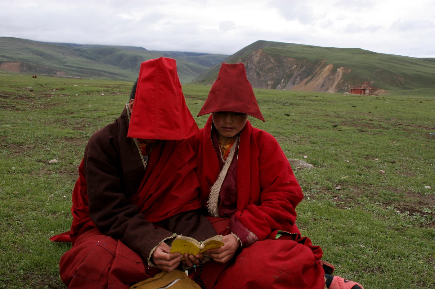 一只小鸟从山崖上飞下来, 在昌曲上盘旋了一圈, 消失在觉姆区那连成一大片的小屋的上空, 天渐渐亮了, 草原上出现了许多白色的帐篷, 但我却发现自己陷入了一片红色的海洋, 成百上千的觉姆从我身边走过, 她们有的去转经, 有的去上堂, 有的下河洗衣, 有的去草地打坐, 一时, 河边, 山崖, 草原, 大殿的庭院, 山坡上到处是红色斑点, 她们集中起来就像是展开的一幅红色唐卡, 她们分散开来就像一片撒开的珊蝴珠, 她们排成一行就像是一根红色的丝线, 她们下山回家就像是一片消失的红云, 她们从我身边走过, 全都露出一种友善的笑容和几分亲切的好奇, 我发现自己从来没有同如此巨大数量的女性同处一地, 我也对她们的世界充满了好奇。