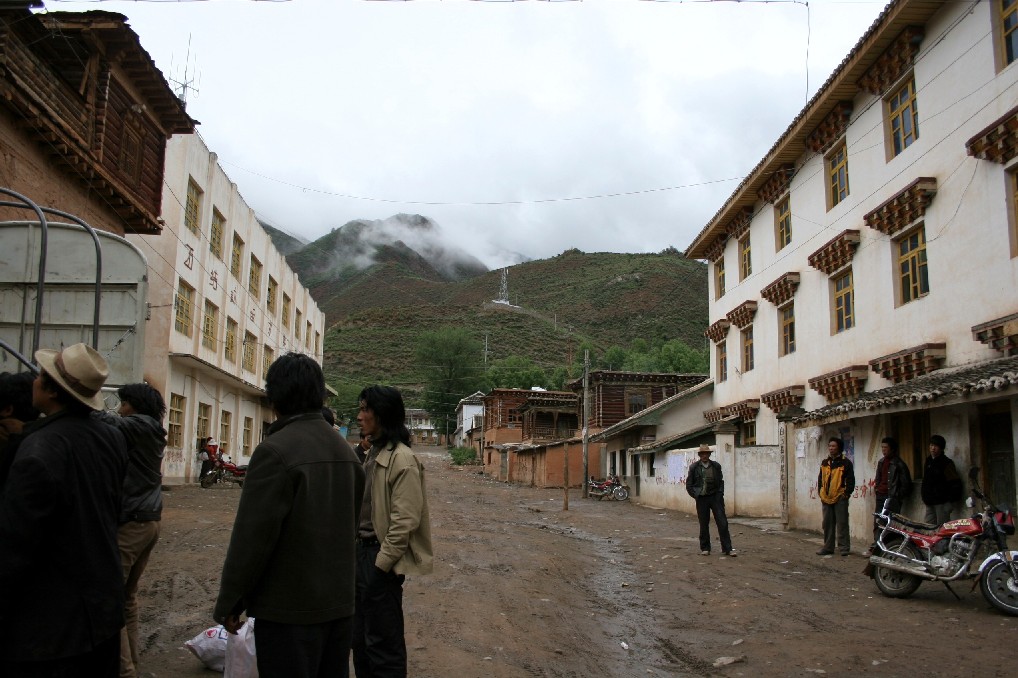 但是早上的河坡乡政府所在地, 却像是西部片中的某个小镇一样, 泥淋的街道上两边的小商店全开着门, 但是没有人来招呼客人, 几个像是西部牛仔样的藏族小伙子在装一辆货车, 乡政府的大街上居然没有一个卖河坡工艺品的店子, 我们的车子开进来, 吸引了所有人的眼光, 但不过如此, 他们看看我们, 觉得与他们在做的事情无关, 于是没有理睬我们, 我们似乎是到了一个不太受欢迎的地方一样, 我走进一家小卖部问了问哪儿可以买到河坡的藏刀, 回答居然是: