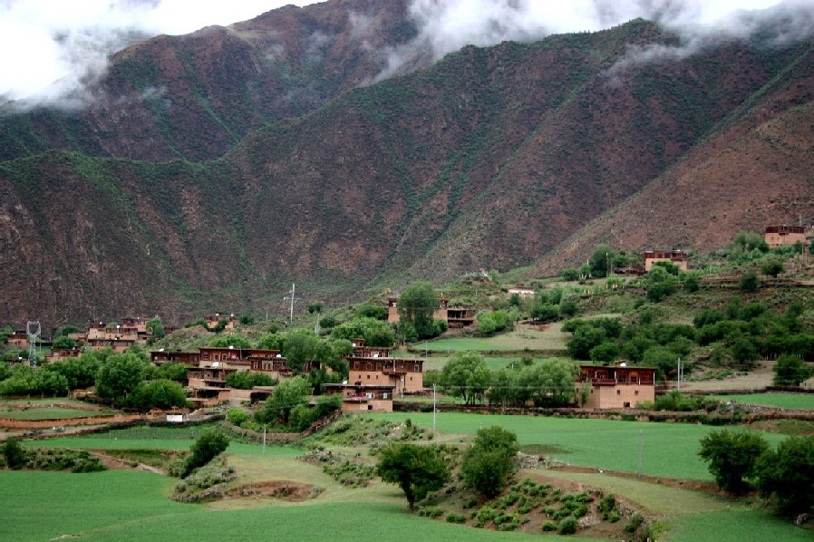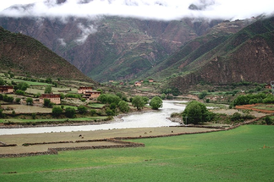 初夏, 赠曲河里的水还是清的, 干旱的年头水不大, 河边田里的青稞还是一片翠绿的嫩苗, 凌晨下过了雨, 雾气顺着山坡慢慢上升, 曾经以金戈铁马转战草原的霍尔族现在满足于田园如画的农耕生活, 在这之外, 他们个身怀绝技, 家家修起了雕梁画栋, 又高又大的霍尔式样的藏房, 每一家的窗子都用上了极其精美的雕刻和油漆, 房子那又粗又大的圆木都用上了霍尔那独特的绛红颜色, 这种颜色在大气之中透显着豪爽和潇洒, 颜色鲜明但不过分张扬, 这样的房子在山坡上, 树林中自然排列, 它们面对大河, 仰望雪峰, 在雾水涟涟的夏日清晨, 显示出几分祥和和生气 , 远处深山里嘎陀寺的方向发散出一片像是被射向苍穹的白云, 这些白云随着高度的上升而变换成不同的颜色, 最后与蓝天融和为一片, 清凉的河风顺着山沟吹过来, 田里的苗, 河里的波, 山上的树, 天上的云, 泛起一层微微的波澜。