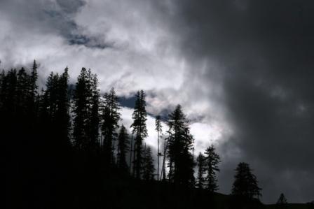 几只白唇鹿从高高的草甸上走下来, 暴雨来临时, 山顶的平直草甸上无处躲雨, 山上雷电交加, 白唇鹿群分散开来, 纷纷走向更低一些的森林里避雨, 突如其来的大雨和震耳欲聋的雷声使她们的警惕有所转移, 在密集的森林里, 她们无法保持群体的集中, 有些鹿子走散了, 她们在林间的缝隙里寻找着同伴, 她们的注意力全部集中在搜寻同伴的眼光里, 她们的脚步开始有些紊乱和显出焦虑, 她们那本来就十分柔弱的防守能力此刻处于最低点。
